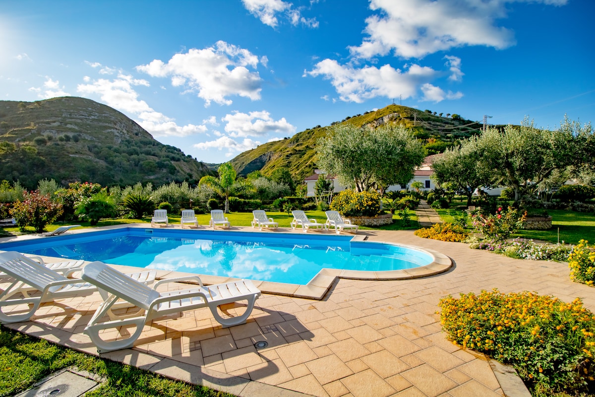 鄉村度假勝地。美麗、全新( 2010年)、地中海風格的低能量房屋,可欣賞迷人的海景和Stromboli ,位於有700多棵橄欖樹、鬆木和棕櫚樹的公園內。 自然的和平與美景是無與倫比的。 這裡總是涼爽的微風。距離海灘和市場2公裏。 寬敞的客廳,可欣賞迷人的海景和日落。 寬敞的房間,可俯瞰公園和大海。 有遮蔽的大露臺,有休息區和用餐區。需要開車來的。