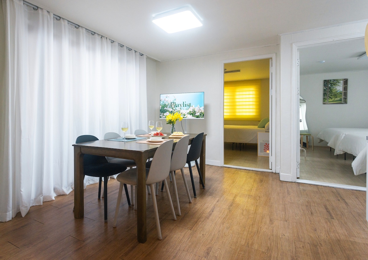 感性住宿 30 坪/新房化站 2 分鐘/免費停車/寬敞客廳/金浦機場.弘大/小型聚會.家庭聚會推薦/10 人住宿