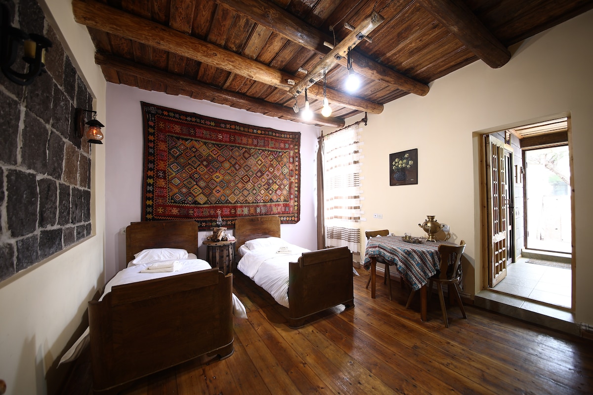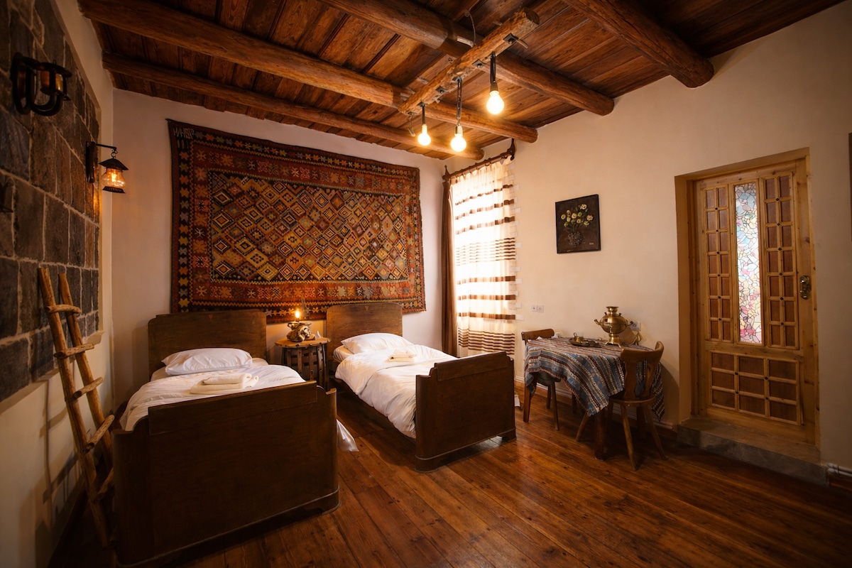 這間雙床房位於Communa Guesthouse的二樓。 配備您所需的一切:獨立衛浴、冰箱、水壺、茶、小型工作區域、可欣賞城市景觀的大露台。 房客可以在共用空間享用咖啡、閱讀書籍和聽黑膠唱片,樓下的酒吧則提供頂級亞美尼亞葡萄酒,而且城市下方還有一條隱藏的隧道。