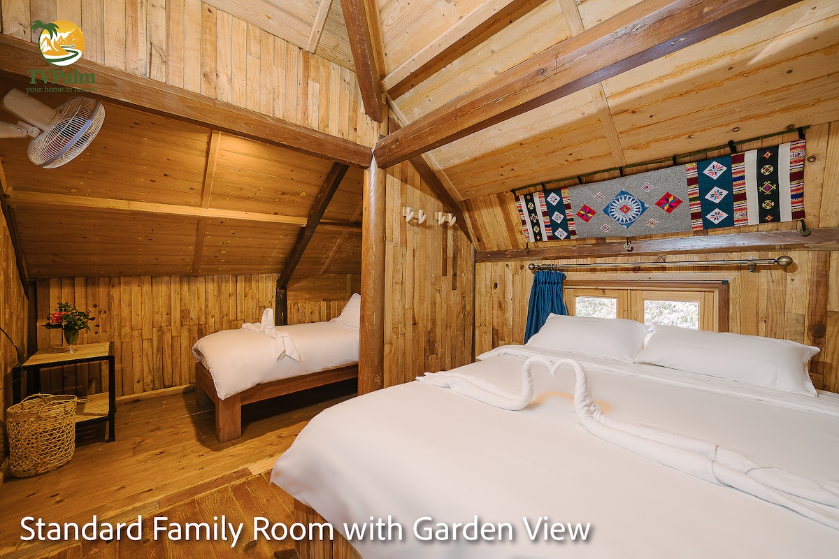 雙床房可欣賞花園景觀,並設有共用浴室,設計氛圍溫馨,結合木材和天然石材元素。