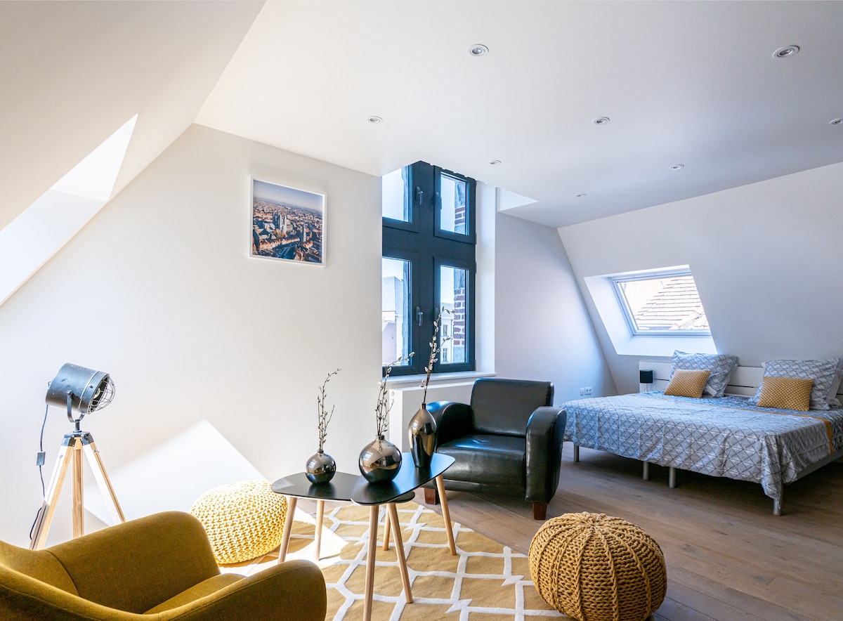 La Camuche de René Desclée is a beautiful loft-style duplex apartment with terrace, fully equipped, free broadband wifi throughout, air-conditioning in bedroom and kitchen. It sleeps 1 to 4 people, with an open mezzanine bedroom area (suitable for children) above the main bedroom area. The flat is located on the 2nd floor of a typical building, with a modern, well-cared-for décor that makes reference to Tournai and invites you to discover its heritage.