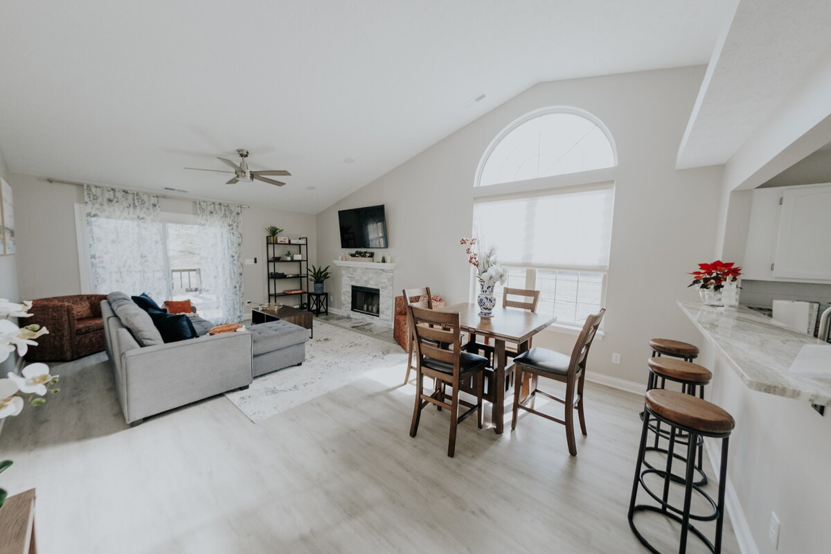 在這個全新翻修的西田寧靜度假勝地與家人一起放鬆身心。這間3間臥室/2間浴室的牧場位置方便,距離大公園8分鐘。最多可供10人舒適入住。設備齊全的廚房是房源的心臟,配有新電器和早餐吧座位。兩間浴室均設有雙水槽,讓您輕鬆準備。享受私人後院空間,有寧靜的小溪,或步行前往附近的莫農步道(Monon Trail),有超過25英里的步道。