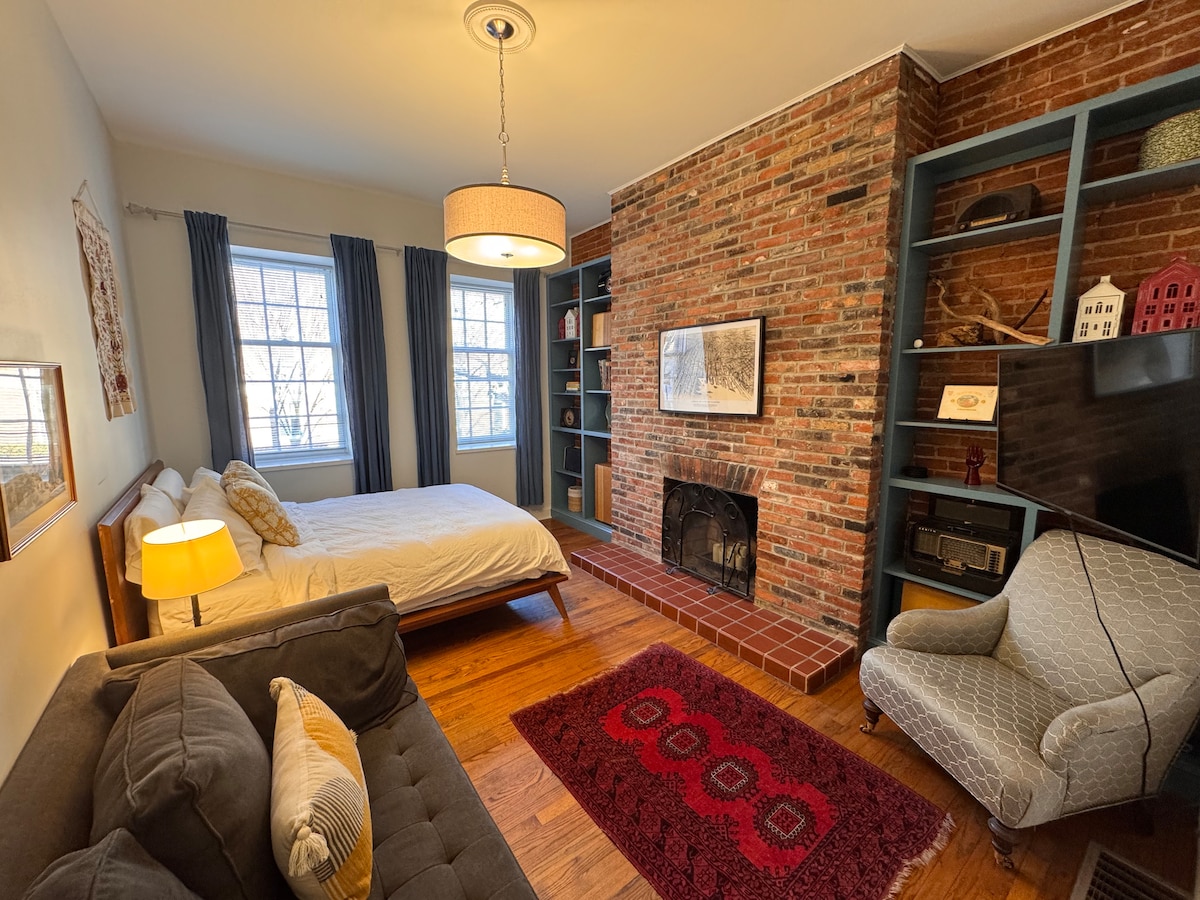 Discover a chic retreat in Mount Washington, Baltimore. Solos, couples, friends, & families: sleeps up to 3 on a queen bed & twin-sized trundle (upon request). Enjoy an entertainment system, work space, & kitchenette. Relax on the deck overlooking a large fenced yard, perfect for your dog to play! Located in a peaceful, safe area. 10 minutes from downtown, 5 minutes from Hampden or Lake Roland. Walk to shops, grocery, restaurants, & a light rail station. Ideal for Hopkins visitors & sports fans.