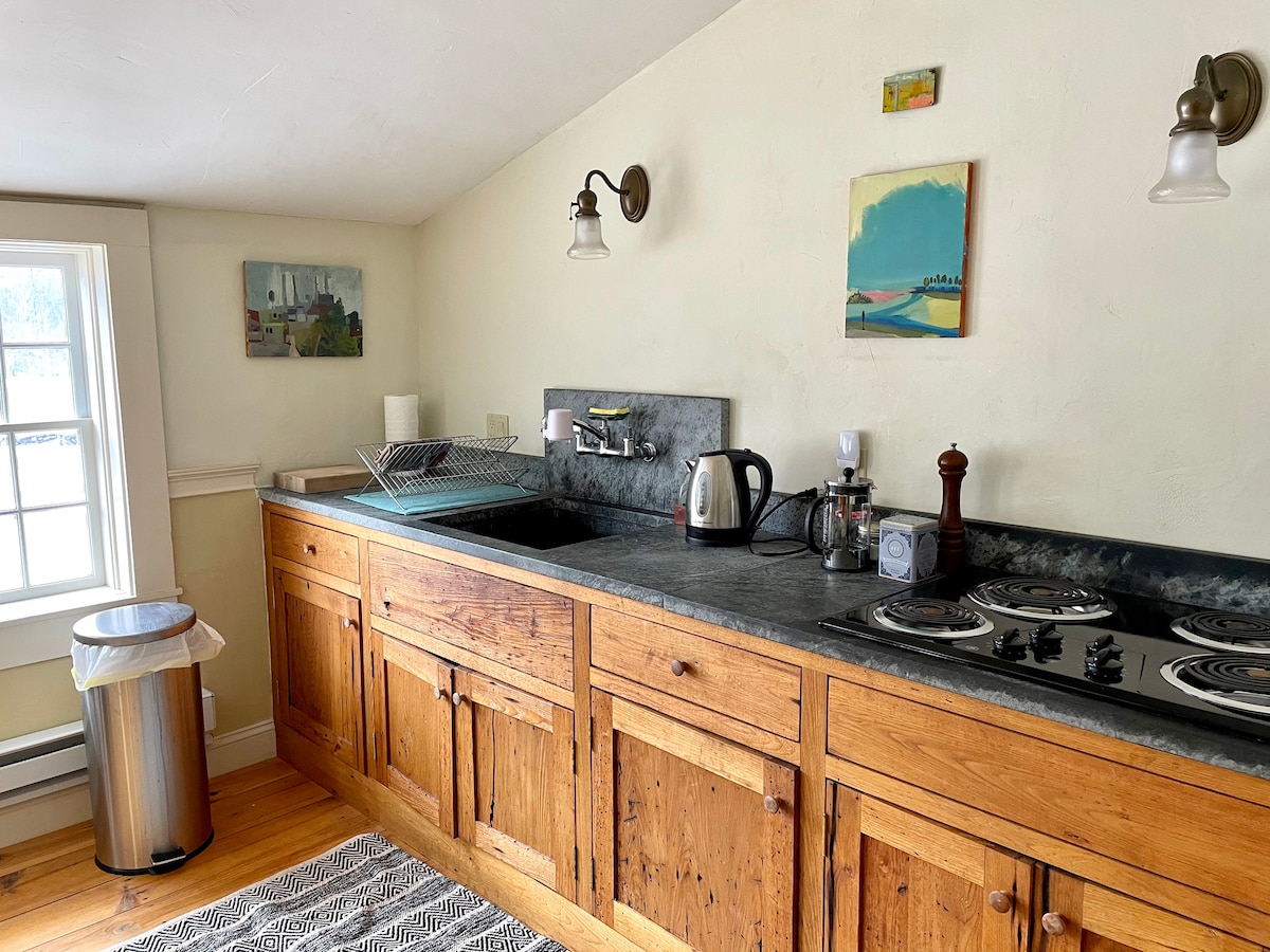 Sunlit guest suite in a 275-year-old farmhouse cozy and full of art and southern facing windows. Back yard trail leads into to Casalis State Forest. , enjoy scenic trails for biking, hiking at all seasons. Peterborough's quaint and historic downtown (5min drive) with yoga studio, cute restaurants, bookstore, tiny movie theater and neighborhood grocer. Meadow View offers a 750 sq ft private suite with a king-size bed, clawfoot bathtub, and a mini kitchen. Your comfort is our priority.