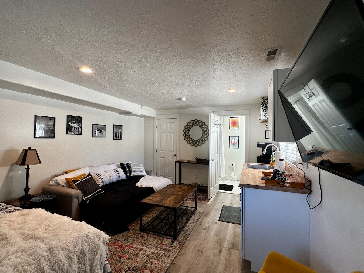 在這個設計時尚又安靜的空間中好好放鬆身心。奧格登市中心,距離市中心約5分鐘,度假村在30-45分鐘內。此房源位於安靜安全的街區,提供您旅行住宿所需的一切;配有小廚房、洗衣機/烘乾機、浴室、標準雙人床、餐桌、起居區、辦公桌、WiFi、有線電視和靠近私人入口的免費停車位。無需支付清潔費!此外,房客可以使用戶外圍欄,讓需要伸展筋骨的寵物在外面活動。