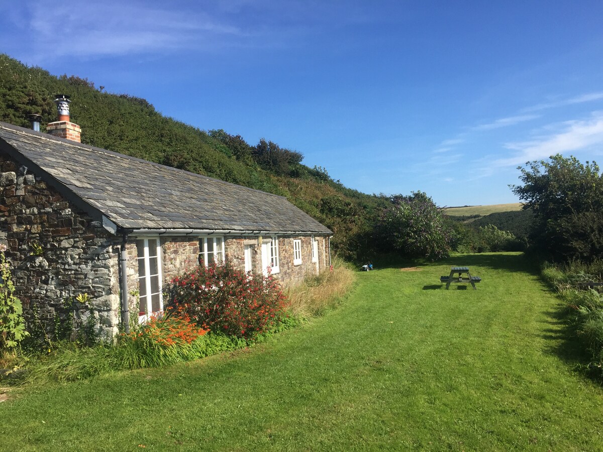 HARTLAND North Devon: Little Barton Hartland Cottage lies within a small farmstead of traditional slate and stone buildings at the end of a long 'green lane' flanked with wild flowers. 7 mins by car from Hartland Quay. An ECO place run on ORGANIC principles. Wild walks along deserted beaches, windy headlands and wooded valleys. Great Atlantic swimming and surfing. Clear night skies. A roaring fire in the woodburner. Seasonal sea views from your bedroom. A wonderful escape from the city!