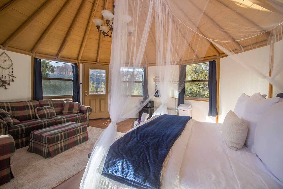 從山頂私人蒙古包欣賞紅岩懸崖和塞維爾河的景觀。距離紅峽谷和風景小徑12號10分鐘,距離布萊斯峽谷25分鐘,距離柯達色盤地45分鐘,距離錫安1小時。雙人床、全套浴室、配備洗衣機和烘衣機的洗衣房。 獨立臥室配有一張雙人床,客廳配有一張雙人沙發床。 請注意:此住宿不適合嬰幼兒入住。歡迎4歲以上的兒童。 抱歉,不可攜帶寵物!