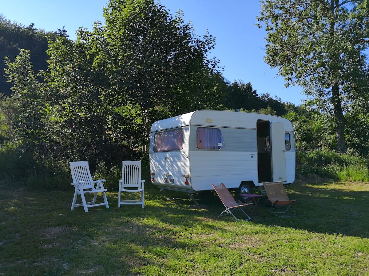 Petite caravane vintage sur un terrain au calme derrière notre ferme. Sur place jolies promenades à pied, en vélo, pêche et baignade dans le Lignon.