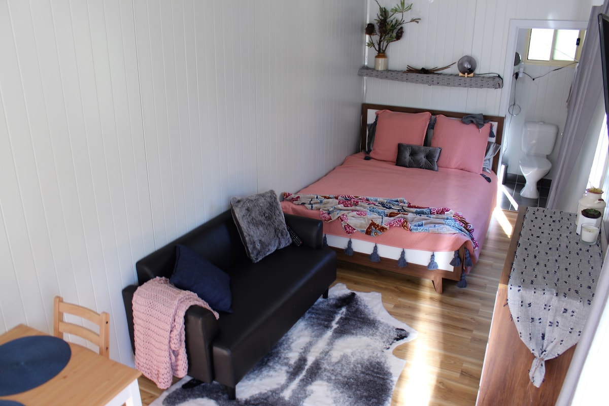 Down the end of your road you arrive to your bushland sanctuary overlooking breathtaking views... As you relax and take in the scenery all you can hear is the sweet sounds of the emptiness of the valley. Your home away from home is a new cabin, with modern kitchen, air conditioning, open plan lounge room with queen bed. This escaper's paradise gives the choice to relax or to explore the natural wilderness and the town. Cafes, cider sheds and the botanical gardens are on your door step.