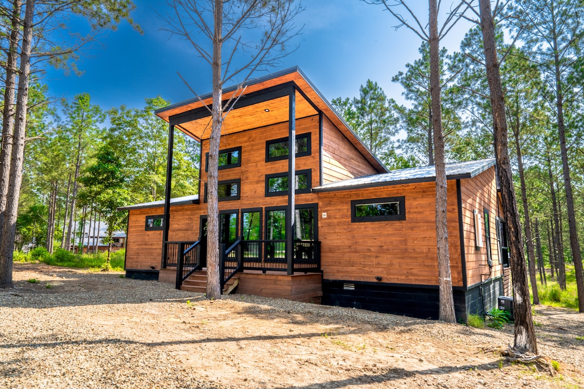 現代豪華小木屋 | 2 間加大雙人床套房 • 電動車充電器 • 寵物友善 探索The Modern ,這是一個令人驚嘆的、設計前衛的小木屋,位於Broken Bow的3.5英畝私人土地上。 擁有18英尺高的天花板、大窗戶、全白廚房、燃木爐和2間豪華特大套房(其中一間配有浸泡浴缸)。 欣賞森林景觀、在火邊取暖,還能在現場為電動車充電。 也歡迎狗狗入住!立即預訂你的難忘假期。