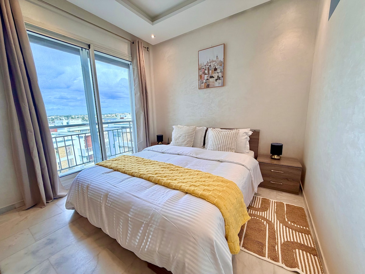在這間全新翻修的 2 房公寓中體驗舒適與優雅的融合。明亮、寬敞、溫馨,營造出溫馨而時尚的氛圍。享受 24 小時全天候保全、私人停車位和充滿咖啡廳、餐廳、雜貨店和附近兒童公園的熱鬧街區。在大露臺上放鬆身心,欣賞絕美景色。使用 Netflix 享受娛樂,並使用高速 WiFi 保持聯繫。非常適合家庭或任何尋找拉巴特市中心寧靜而充滿活力的住宿。