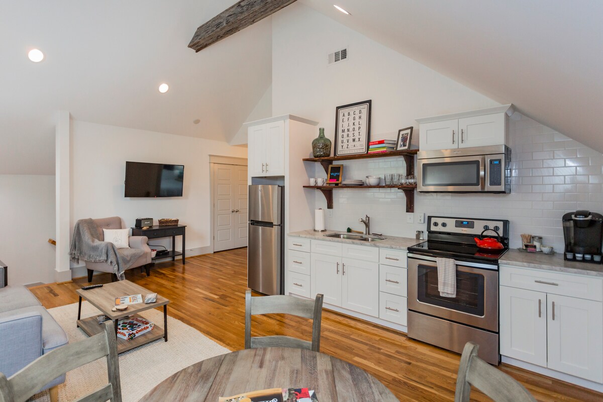 明亮開放的奢華工匠房客空間。 客製化設計,配備全套廚房、閣樓臥室、工作空間、壁爐、定制壁紙和當地藝術品。 當自然光線透過高窗和天窗傾瀉而下時,Gwyneth 就是與女朋友或伴侶一起度過納什維爾度假的完美空間,或是一個鼓舞人心的獨自度假勝地。 基於安全和潔淨的原因,此空間不適合寵物或兒童入住。