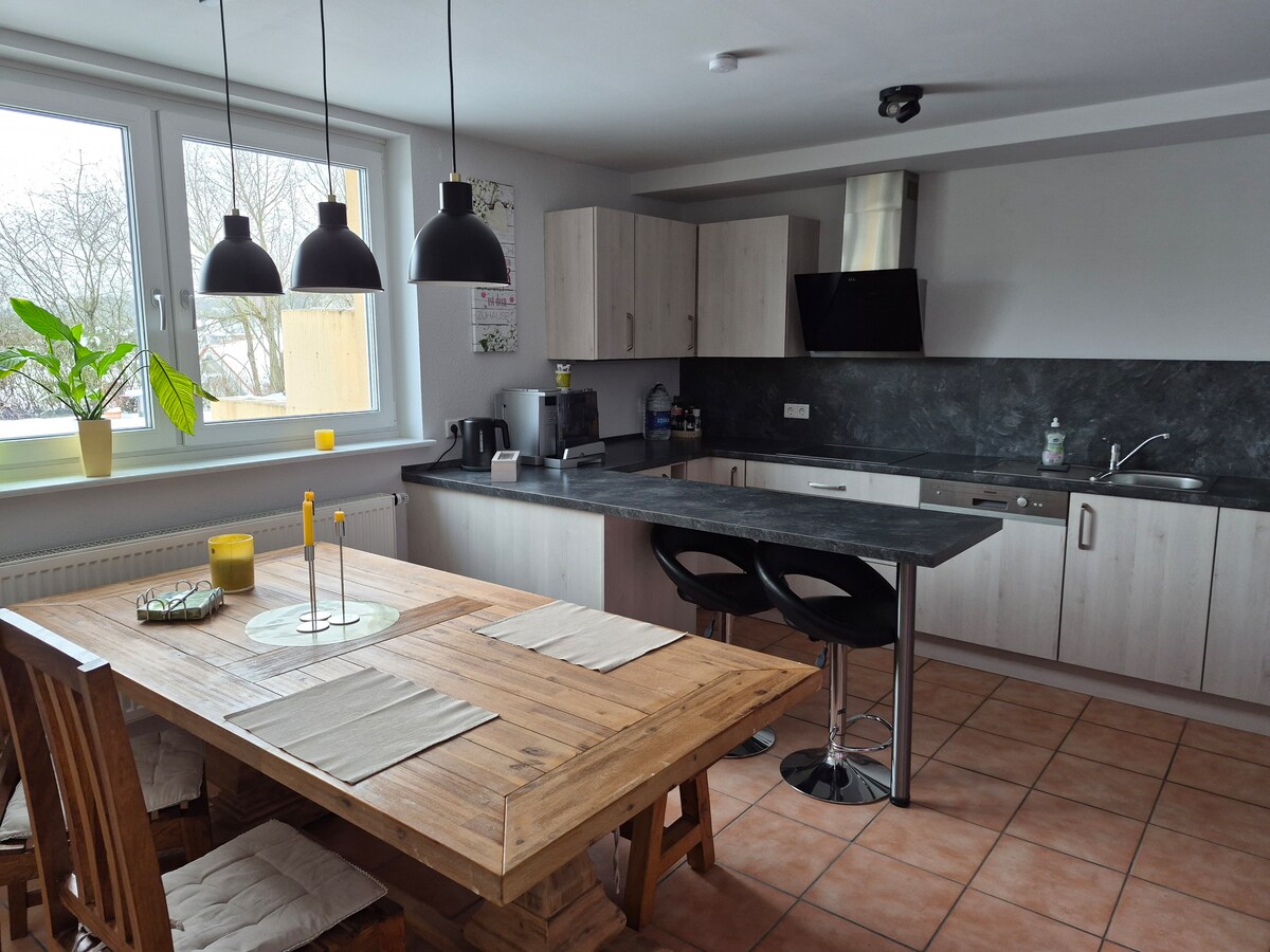 全新、現代且獨特的公寓,距離 Playmobil 只有 700 公尺。 - 非常適合團體、公司、大家庭或朋友。 如果兩個家庭一起入住,每個家庭都可以使用自己的浴室。 - 舒適且現代化的裝潢。 -設備齊全 - 為孩子們準備玩具和書籍 -房子前面有免費停車位。 - 免費 WiFi - 房子旁邊有餐廳「Linder Grube」。 - 附近有步行道、森林、農場,距離牛奶站 500 公尺