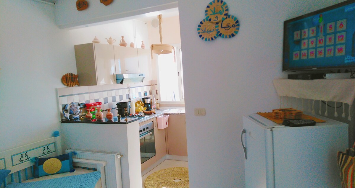 El houch是一間以傳統突尼西亞風格裝飾的公寓,展現出獨特而典型的風格。 步行2分鐘即可抵達海灘 距離Port El Kantaoui (Harbour Marina) 3公裏 距離蘇斯購物中心(商店、電影院、兒童公園和餐廳) 3公裏 距離蘇斯市中心10公裏(蘇斯麥地那,考古博物館)