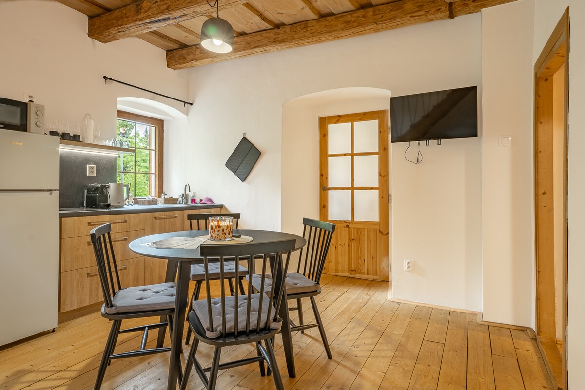我們的公寓位於耶塞尼克山脈的中心,靠近Základna rychlebských stezek。四周環繞著草地和森林,完全私密。附近有採石場和池塘可供游泳,城堡廢墟,您可以直接從門口出發,進行美麗的散步。步行、騎自行車、甚至帶著嬰兒車。耶塞尼克溫泉就在山丘對面,文化愛好者會喜歡在拉奇谷的舞廳或在亞沃尼克的城堡。您喜歡喝咖啡和吃美食嗎?在Žulová的Eleanor咖啡館,他們會像國王般照顧您。