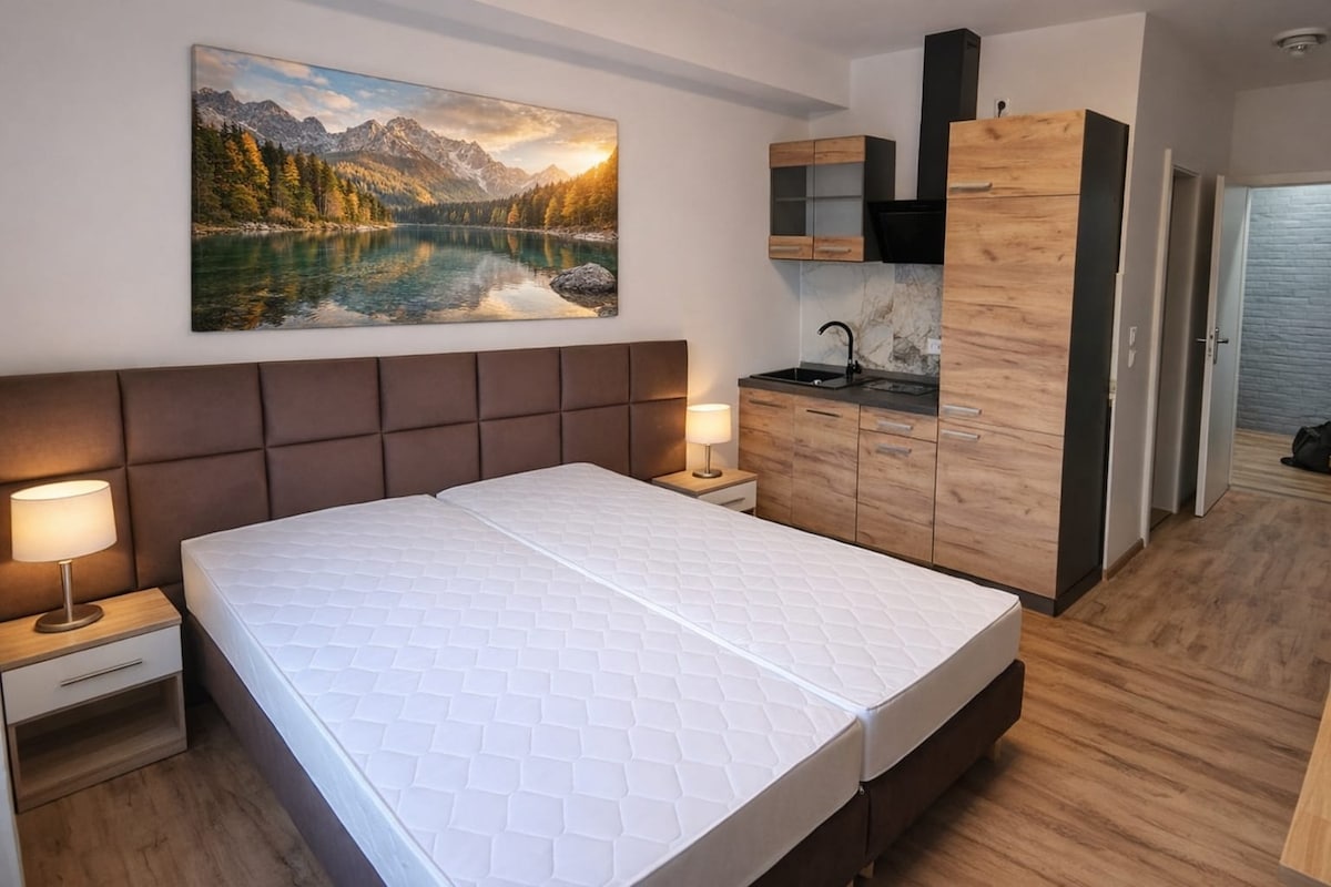 獨立客用住房安靜地位於死巷位置–非常適合帶有寵物的情侶或帶有孩子和狗的小家庭。 配備現代化廚房、寬敞的起居空間、陽臺和前門外的停車位,是完美的度假勝地。 樓上有一間臥室,同一間房間內有兩張新鋪的床,因此此房源不適合團體或四位成人入住。 如有需要,可以提供第三張床。