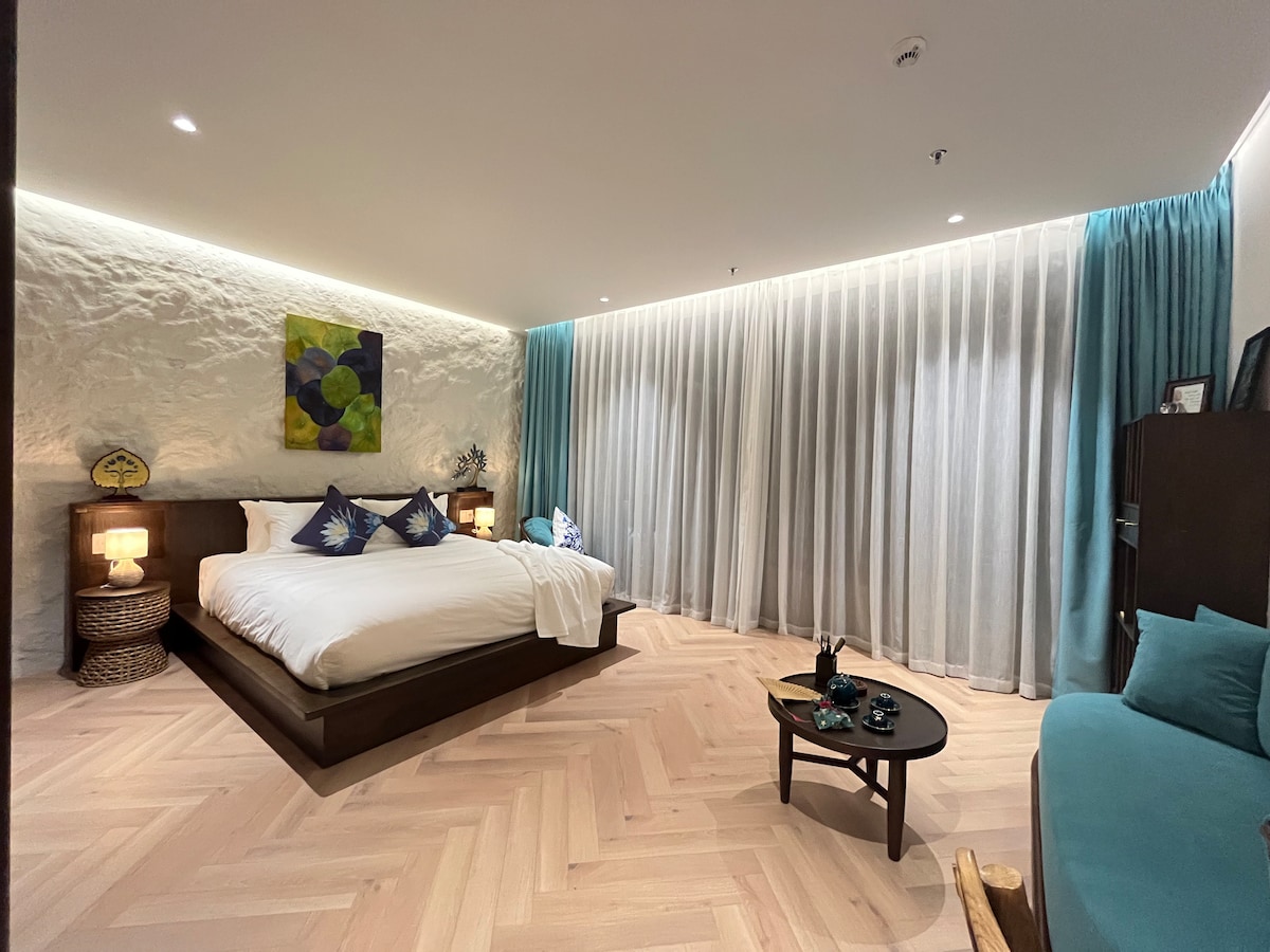 Welcome to our unique oceanfront corner suite right across My Khe beach. It is meticulously designed with a coastal theme and equipped with high-end furnishing. With 80 square meters of elegantly designed living space, our beach home promises a truly unforgettable stay. Important Notice: Our property is situated right at the central beach, directly across from where holiday events take place. Additionally, there's a bar nearby that plays music at night.
