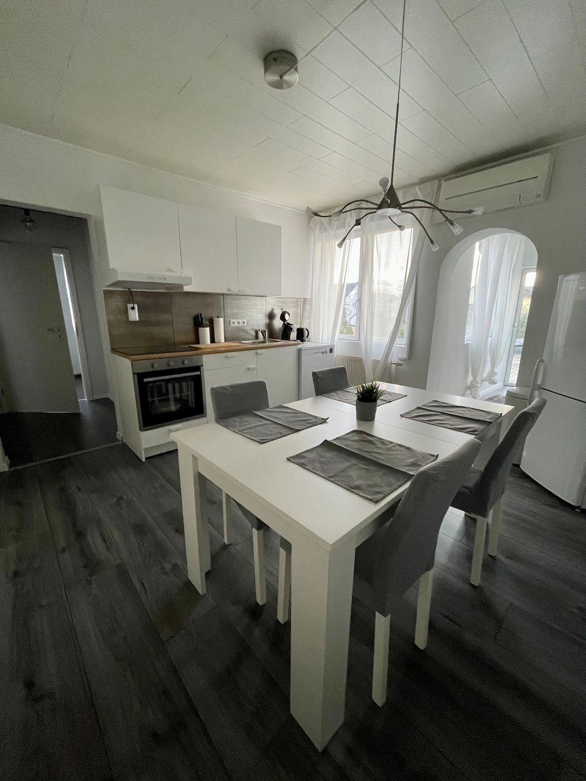 Helles 1-Zimmer-Appartement ca. 48 m², Küche, Bad, separater Eingang, Terrasse. Die Wohnung befindet sich im UG, über 9 Stufen zu erreichen. Parkettboden und Fußbodenheizung schaffen eine angenehme Atmosphäre. Die Wohnung ist mit einem 1,60 x 2,00 m Bett, Kommode, offenem Kleiderschrank, Schreibtisch, Sesseln, Fernseher, Esstisch, Stühlen ausgestattet. Eine Küche mit Grundausstattung bietet die Möglichkeit zur Selbstversorgung. Großer Kühlschrank und Cerankochfeld mit Backofen sind vorhanden.
