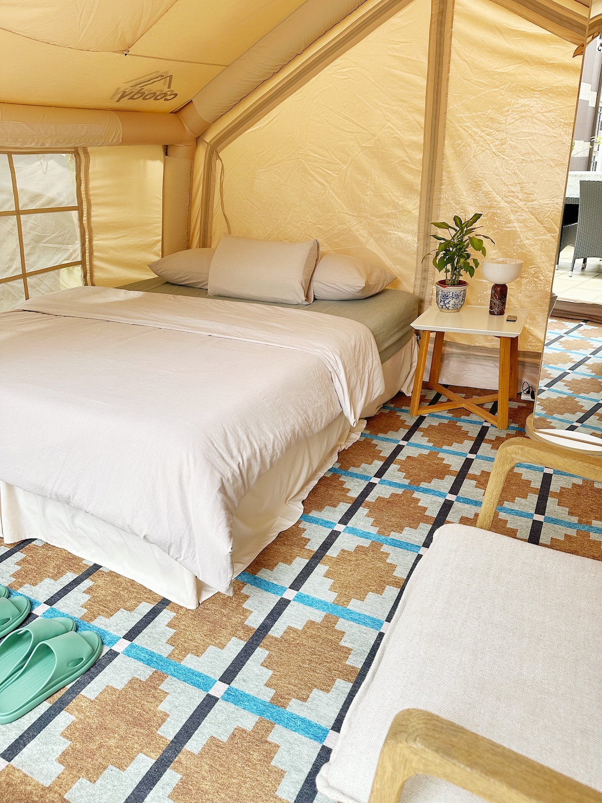 A private rooftop tent stay in Mid‑Levels, offering open‑air living and a rare pocket of calm above the city. The tent is fully equipped with AC, heating, a dehumidifier, soft lighting, and a queen bed. Just outside are your own WC/shower, sink, mini fridge, and a dining table for six. The street is steep and the building has no elevator—you’ll climb four flights to reach the rooftop. Pack light and enjoy a peaceful escape above Hong Kong!