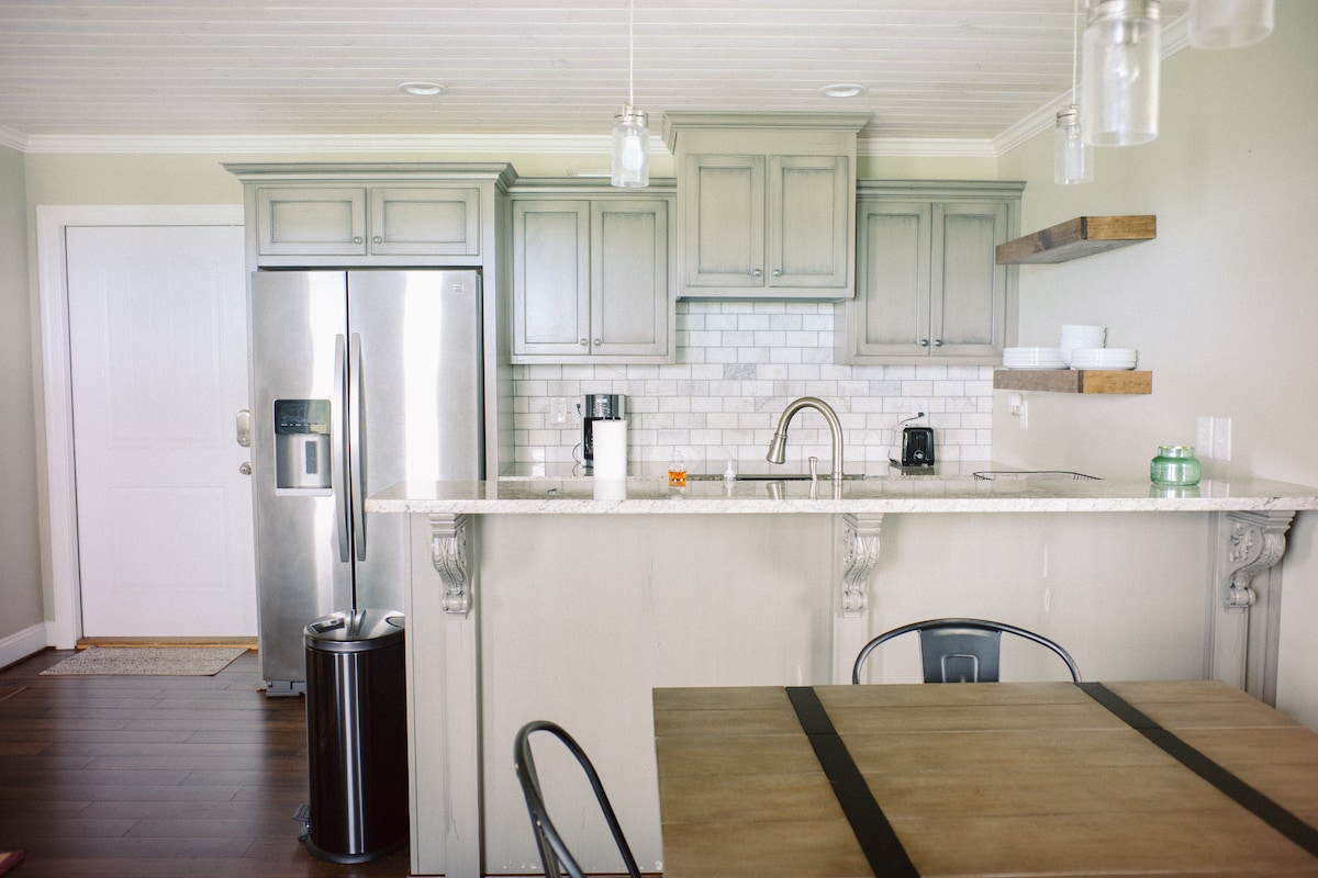 Shiny Tiny位於鄉村小巷盡頭的3.5英畝土地上,俯瞰牧場庭院。非常私密。有很多船/拖車停車位。步行即可抵達尼利亨利湖。Shiny是一個定制的重型便攜式牙科辦公室,在2019年由建築商房東改造成500平方英尺的小型房源。 寵物友善。全新、可愛且舒適。湖泊可通往皮艇、游泳或船。主臥室、客廳和全功能齊全的廚廚房,配有拱頂天花板、浴室配有淋浴間和真正的馬桶、閣樓配有雙人床和私人篩選門廊。