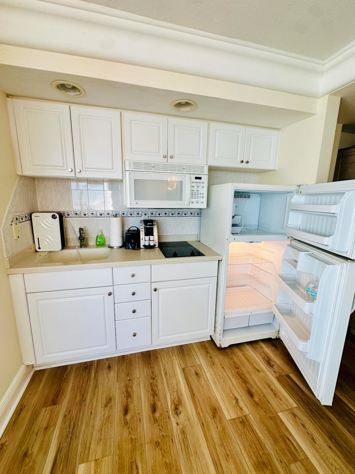 Simple, clean living on the beach. Complete with full kitchen, this hotel style studio condo on the beach is yours to enjoy along with resort amenities including 2 pools, fitness center, and sauna. The central location puts you in the center of the Daytona Beach action with easy access to supplies at the Publix across the street. The balcony provides ocean & A1A views. The cozy space is great for a couple’s getaway.
