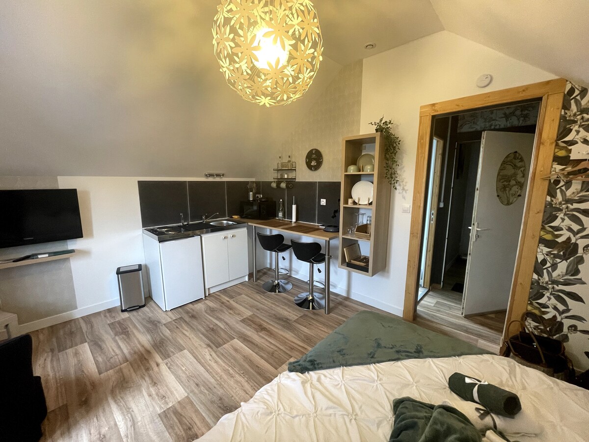 這個穀倉經過全面翻新,煥然一新! 舒適的住宿包括: - 一個廚房區域,配有用餐區(餐具、微波爐、電磁爐),在一天的散步或工作後享用美食,您會找到所需的一切。 - 臥室;由一張 180*200 的床組成,但可以變成 2 張 90*200 的單人床、一臺電視、WiFi 連線,當然還有放衣服的地方 -一間浴室