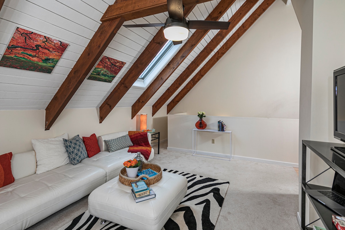 The guest room is light and airy with a private entrance off the back deck. The bathroom is connected to the room and is completely private. The space is quiet and charming with a lovely deck to enjoy. There is parking in the driveway and also street parking. The room is completely private from the rest of the house. The tv in the room has local channels and guests can access with their own accounts (Hulu, Netflix, Amazon Prime, etc).