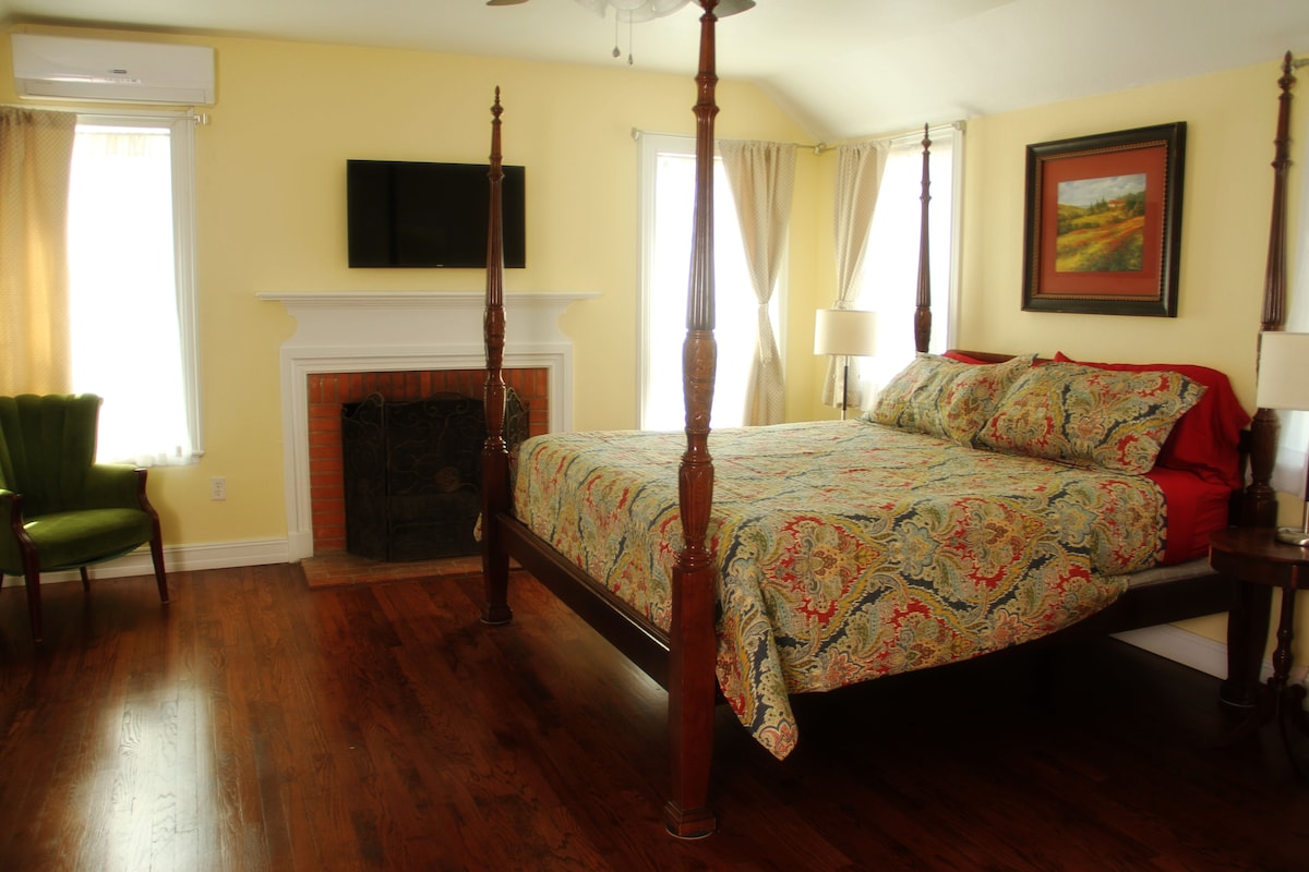 King sized bed, private sitting area, and private deck. The room also has a walk in shower, and soaking tub. The is a great space if you are staying multiple days. Free guest parking and free WiFi. We also cook breakfast, since we are a bed and breakfast not your typical Airbnb.