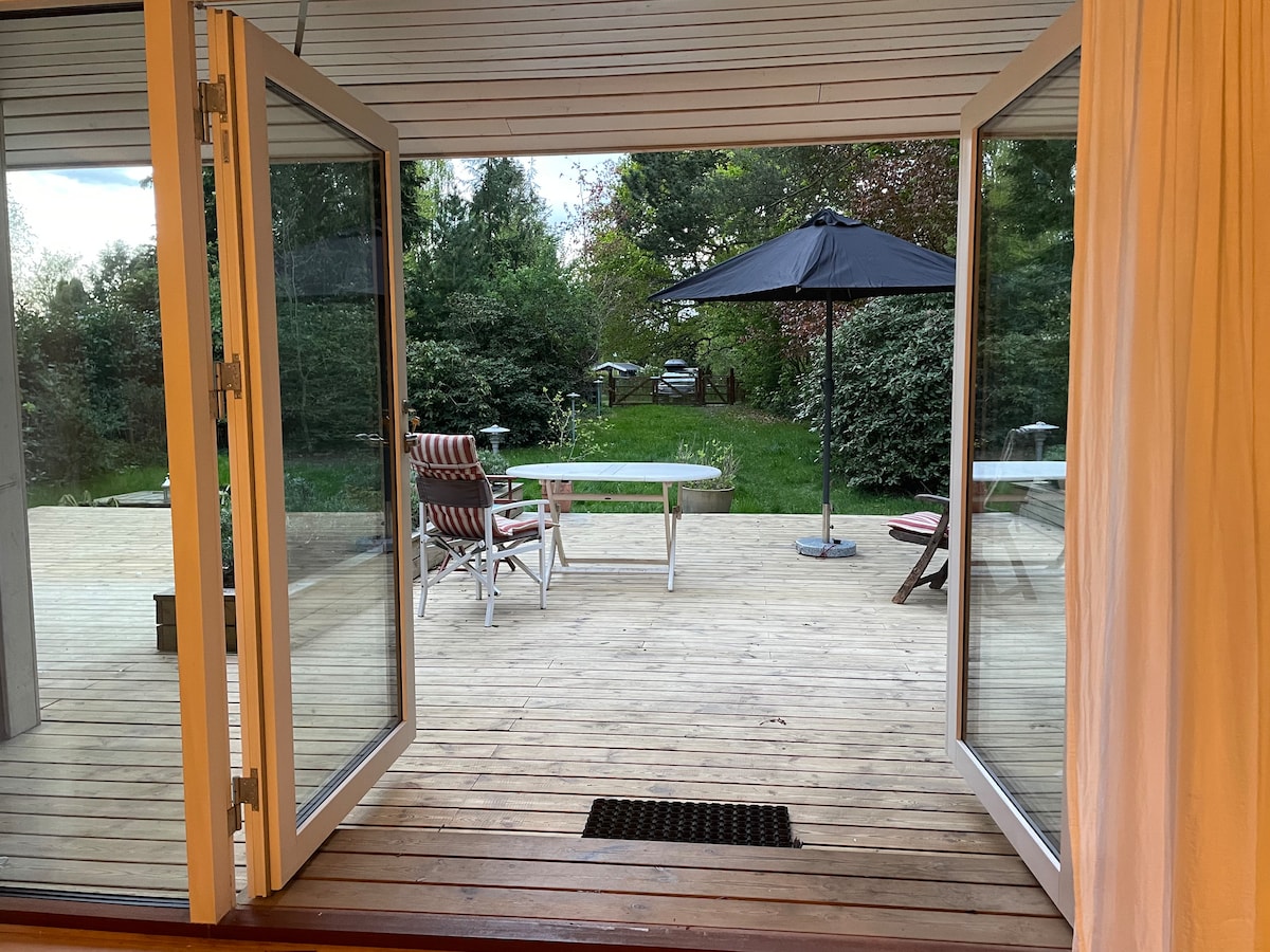 舒適的獨立附屬建築,配有私人露臺,位於霍恩貝克市中心,可眺望海峽。靠近火車站、商店、種植園/森林、港口和海灘。 可直接前往花園。 可再入住1名成人或2名兒童。 額外牀上用品100瑞典克朗/天
