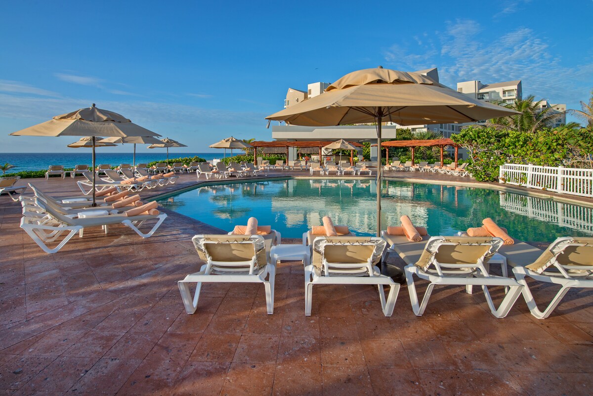 Our location is by far the best in the entire hotel zone! Enjoy the turquoise colors of the Caribbean Sea and the beautiful sunrise every morning. Have a coffee and go for a walk on the beach, relax under a palapa or swim in the beautiful adult pools, family pool or have fun in the water park for children. In the afternoon enjoy the sunset and the majestic Nichupte Lagoon. More than 300 happy visitors assure that your vacation will be unforgettable.