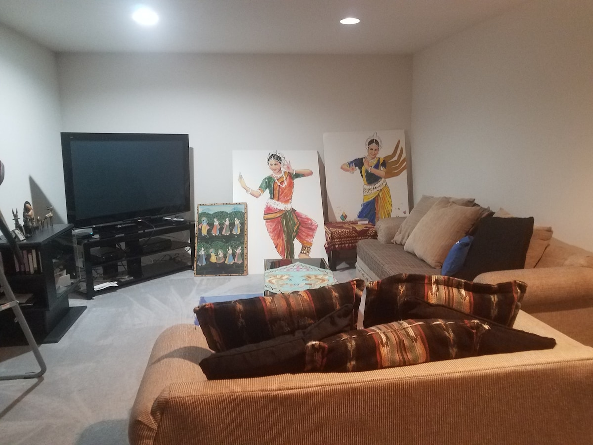 Huge basement apartment with 2 beds and 4 separate areas, kitchen, private bathroom, 65 inch television, exercise equipment and more.