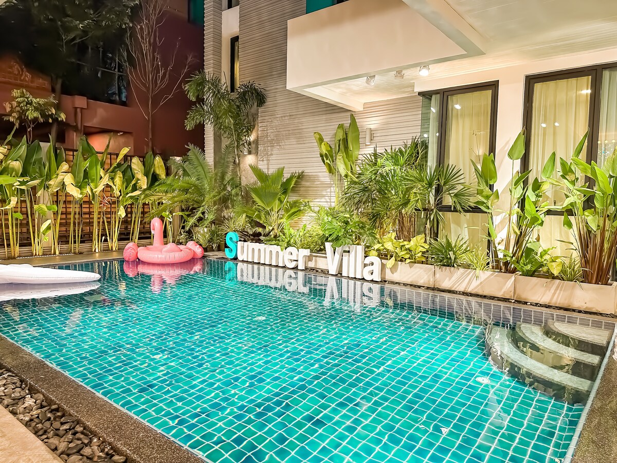 欢迎来到Summervilla.我们的别墅坐落于曼谷市中心,拥有7卧7卫9张床可同时入住18人.无论是家庭度假还是朋友聚会,都能享受私密舒适的空间。 🎤 KTV与泳池|娱乐 别墅配备专业KTV练歌房和灯光设备,随时开场私人演唱会。超大泳池是消暑天堂,大人孩子都能尽情嬉水。户外烧烤炉旁来一场BBQ,留下难忘回忆 🍳 舒适便利|免费早餐 现代化西式厨房可烹制泰国味道,宽敞客厅是欢聚中心。我们每天提供免费早餐,双停车位方便自驾游客。 📍 黄金区位|出行便捷 步行可达地道泰餐馆,驱车短途即达大型购物中心和四面佛等景点。无论探索文化还是享受夜生活,这里都是理想起点。 选择我们,在曼谷市中心创造专属美好时光!