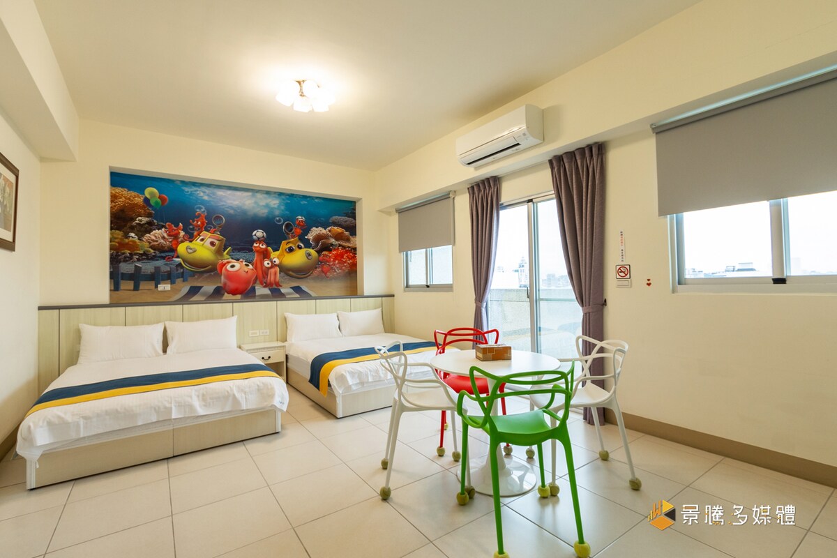 如果需要包車旅遊規劃的客戶們可以來詢問~有與包車旅遊業者合作\ 戶外遊戲:沙灘車、滑翔翼、SUP也可以找我 我們位於大樓內部7樓的其中兩戶,必要時可以分隔成獨立2戶(A B 兩戶),也可以中間開放連通,室內空間為26坪, A戶(龍貓)開放式,有一個客廳,1.5個衛浴,兩張雙人床(可以再加一張雙人氣墊床),如圖:龍貓區 B戶(凱蒂貓)兩間小房間,有一個客廳,1.0個衛浴,兩張雙人床,一張單人沙發床(可以再加一張雙人氣墊床) 所以總共可以睡15人 如有不懂歡迎詢問 lineID:@d_boss
