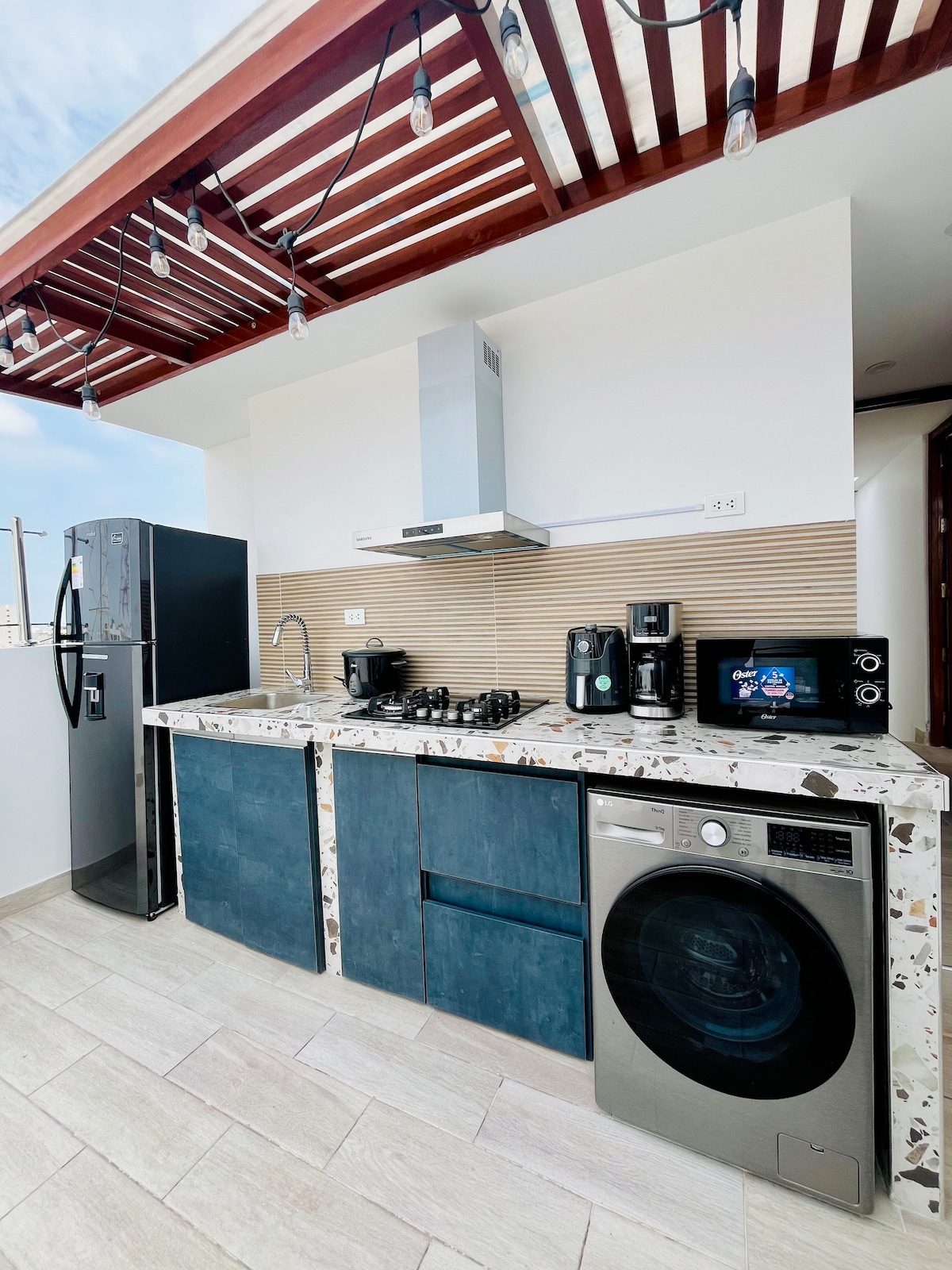 歡迎來到我們在Huanchaco的時尚閣樓! 這片綠洲擁有現代化的設計,為您的住宿提供時尚舒適的度假勝地。 開放式布局設有寬敞的起居區域、設備齊全的廚房和一張可欣賞海景的加大雙人牀。 大窗戶自然光線充足,私人陽臺是品嚐晨間咖啡或在晚上喝一杯葡萄酒放鬆身心的完美場所。 在我們的閣樓,探索時尚和便利的完美融合。