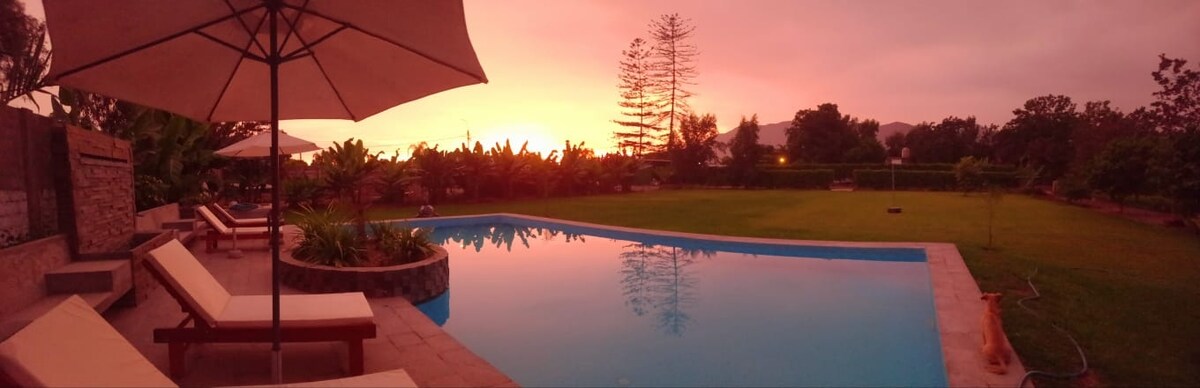 Relájate en familia en Villa Banana, mono ambiente campestre, con kitchenette equipado, 2 camas de 2Pz y 1 individual elevada, comedor, salita, baño con agua caliente. Disfruta del amplio jardín, mesa de ping pong, fulbito de mano, net de voley, tobogan, columpios, bicicletas (4 para adultos y 1 de niño), parrilla, horno de barro, caja china, fogata, living, comedor al aire libre y una estupenda piscina de usoexclusivo. Capacidad máxima para 5 personas