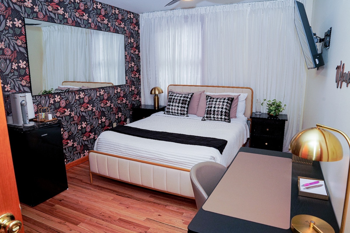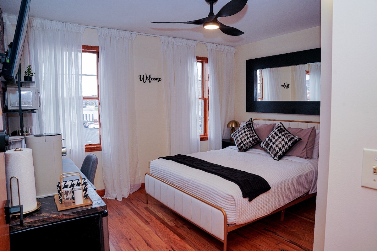 Welcome to Amelia Suites Newark! Room 3 This cozy 1BR, 1BA suite is ideal for 2 guests. Enjoy hotel-style comfort with a private bath, coffee maker, and mini fridge. Located In the Heart of the City ,vibrant Ironbound, just minutes from 10 EWR airport and just 4 minutes to Newark Penn Station—get to NYC in under 20 mins! Walk to Prudential Center, Riverbank Park, NJPAC, and top restaurants ,Perfect for business trips, layovers, or a quick city getaway.
