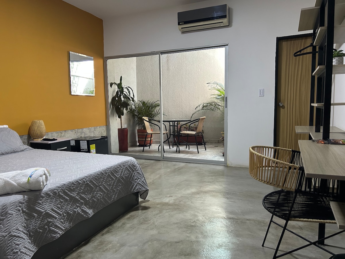 Habitación orientada a patio interior, ideal para quienes priorizan el silencio absoluto y un ambiente tranquilo para descansar. Al no tener vista directa a la calle, ofrece un descanso aún más profundo. Cuenta con cama queen, aire acondicionado, Smart TV, baño privado, clóset, caja fuerte, mini bodega para maletas, mini nevera y cafetera.
