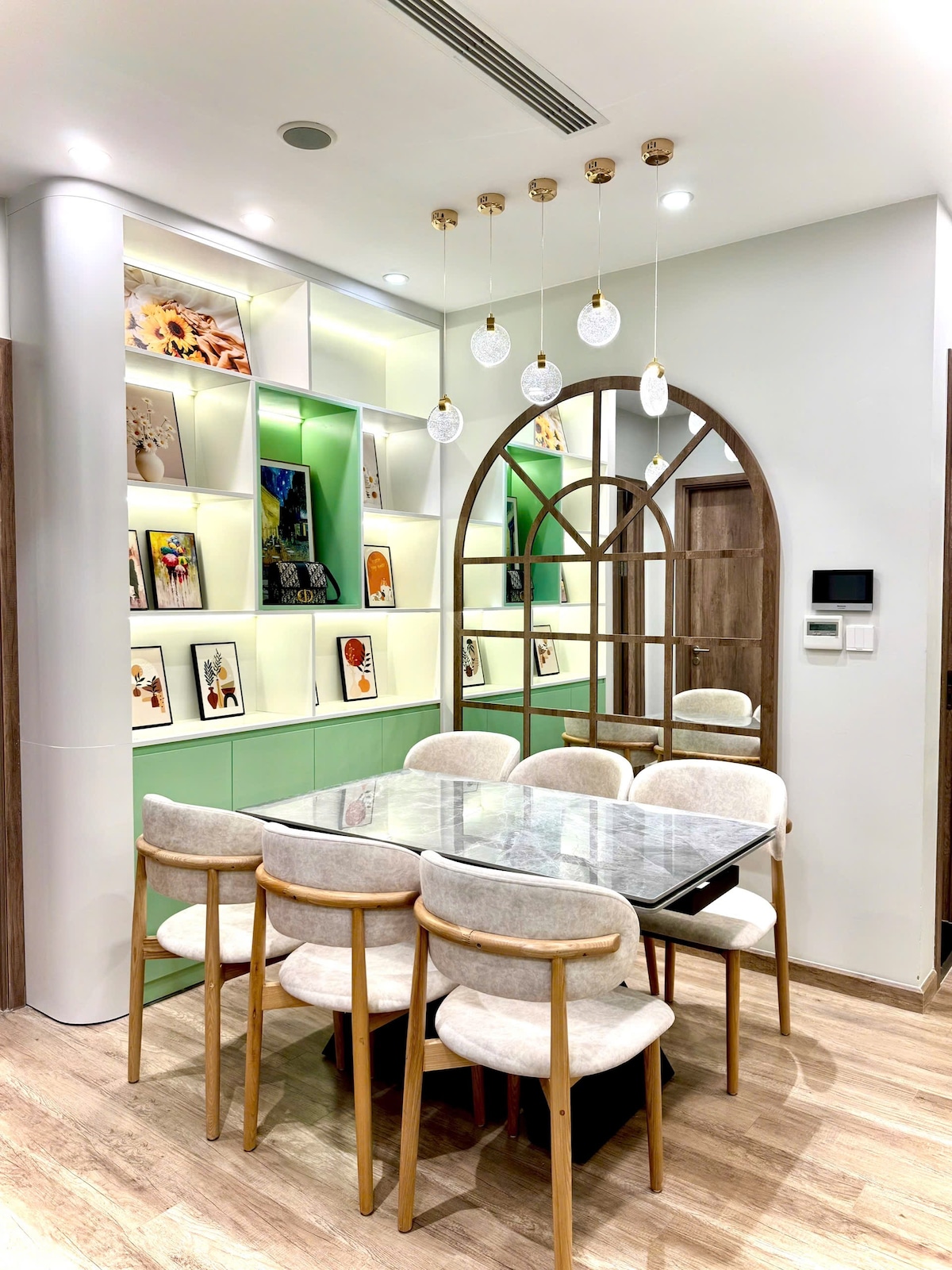 Scandinavian là phong cách thiết kế và trang trí nội thất theo kiểu “Hygge”. Ở đây Hygge tạm hiểu là phong cách sống ấm cúng và thoải mái đến từ đất nước được mệnh danh là nơi hạnh phúc nhất thế giới – Đan Mạch. Không gian phòng ăn tại đây là 1 thiết kế điển hình của Scandinavian. Sàn gỗ tự nhiên cùng chất liệu với chân ghế, bàn ăn và cây cảnh mang lại cảm giác của như đang ở ngoài trời. Các bức tường sơn trắng giúp tối đa hóa ánh sáng. Những chiếc ghế ăn và đèn thả phong cách Bắc Âu hiện đại.