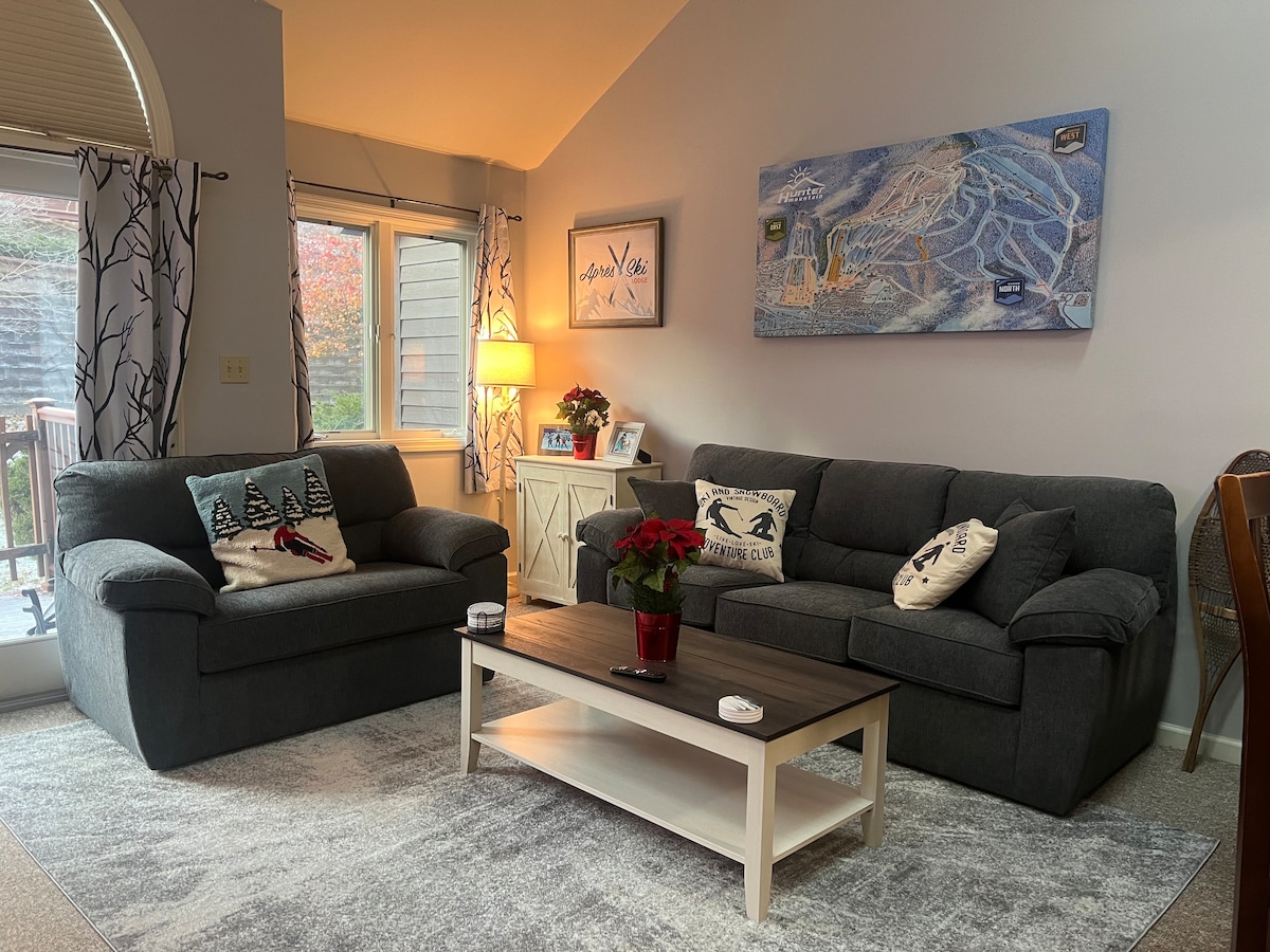 舒適的2BR/2BA公寓,步行5分鐘即可抵達Hunter Mountain! 可供 6 人入住,配有記憶泡綿床 + 可透過奧的斯四人/電梯滑雪回到後面。 2輛車的免費停車位。 燃木壁爐(包括木材)+可欣賞山景的環繞式露台。 設備齊全的廚房、全新的洗衣機/烘乾機、快速WiFi、每個房間都有Netflix和家庭遊戲。 全年皆宜:滑雪、單板滑雪、健行、游泳或單純地在大自然中放鬆。