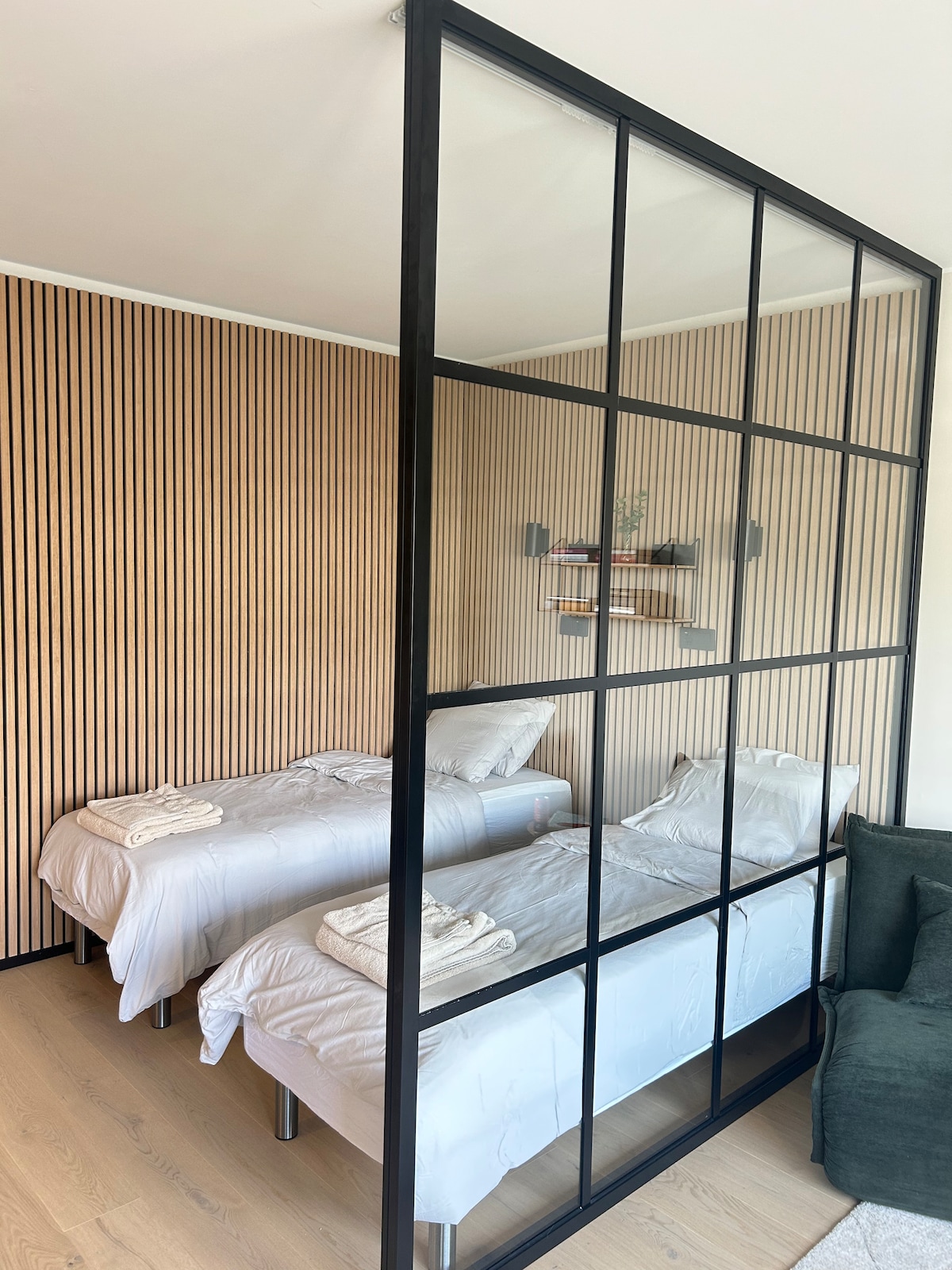 Enjoy a complementary coffee on the balcony with stunning views of the iconic Helsinki Stadium tower. Full kitchen and in-unit washing machine — ideal for longer stays too! A high-quality Italian Murphy bed turns into a sofa maximizing your space during the day.