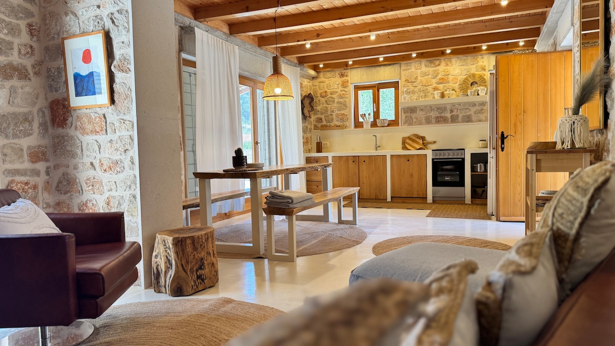 An historic stone stall has been tranformed into oasis, butique villa in the heart of island Hvar. Traditional architecture mingled with bohemian chic decor such as reclaimed wood, local stones, polished white concrete, white curtains, driftwood, hvar paintings on the walls, wicker suspensions and cognac leather sofas. Located in the middle of sunny island Hvar surrounded with olive and almond trees and aromatic plants. Place is intended as a simple and bohemian retreat for a slow life holiday.