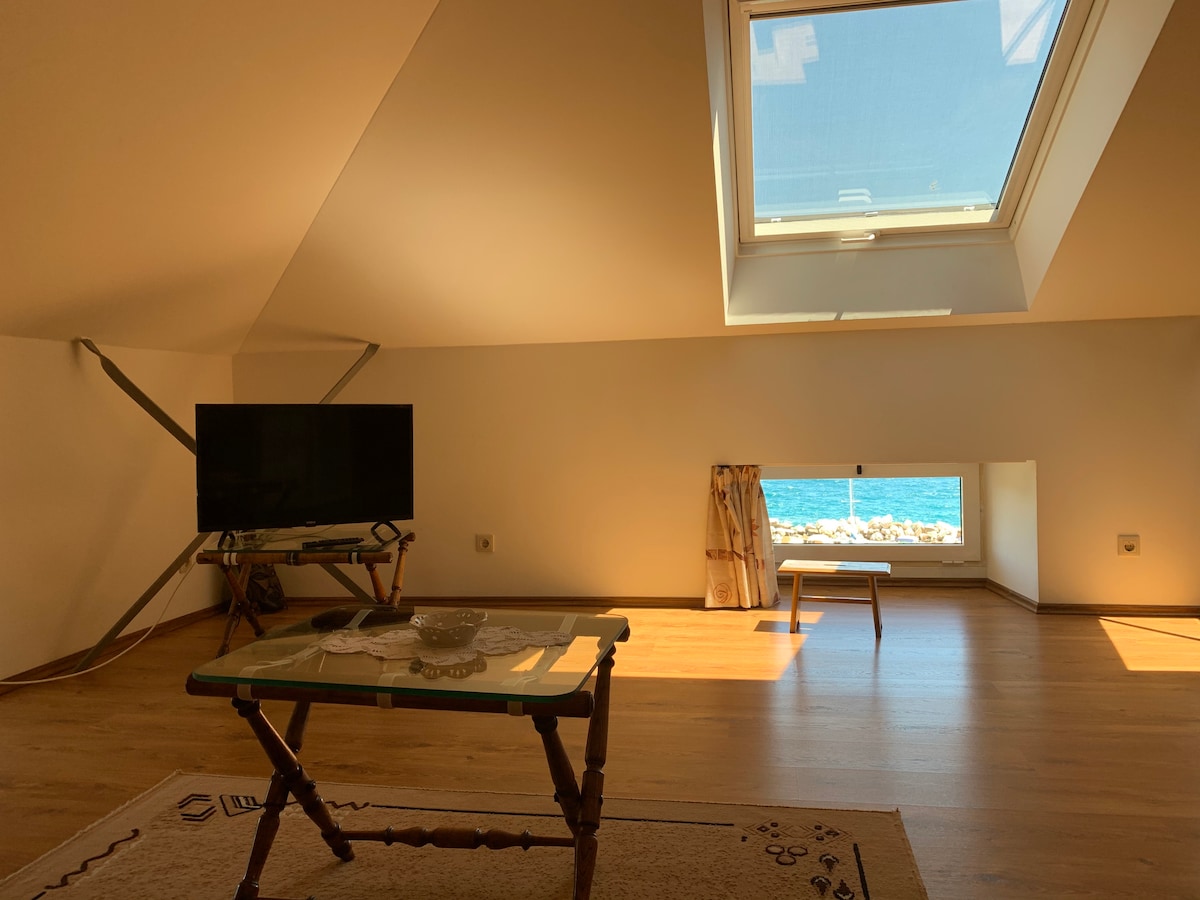 光線充足的公寓(閣樓) 在一棟別墅中,可欣賞美麗的海景和山景。 65 平方公尺的公寓,屋頂露臺可欣賞 250 度的景觀。 鳥飛300公尺,步行5分鐘即可抵達大海。 非常安靜的住宅區。 免費泊車位。 房子後面就是森林,有步行和徒步旅行的路徑。 因為使用了生態建築材料,所以生活健康。 地板冷卻,無空調