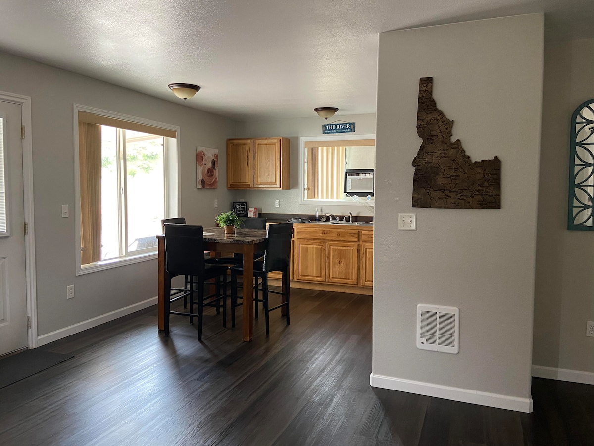 客用住房坐落在山坡上,俯瞰三文魚河、錘子溪公園和公共船舶發射台。距離蛇河匹茲堡登陸的地獄峽谷(Hells Canyon)船舶發射一小時車程。這兩個區域都很適合划船、泛舟和釣魚。這間單間公寓可供4人舒適入住,配有一張大床、舒適的拉出式沙發和獨立全套浴室和淋浴間。房源還有廚房和私人露臺,可欣賞野生動物和百萬美元的景觀!