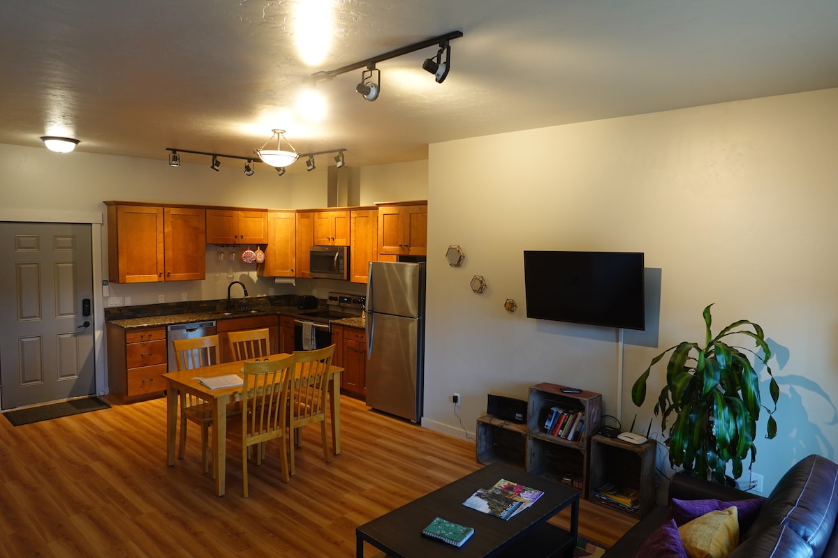 The Lake Loft is a cozy, modern studio, in the heart of downtown McCall. This apartment has a full kitchen with granite counter tops, cookware, & dishwasher. This is the perfect spot for a romantic getaway, business traveler, wedding guests or a family of 3 to come explore McCall. The Lake Loft gets plenty of sunlight and has blackout curtains for a restful sleep. The apartment is on the second floor, accessible by stairs or an elevator.