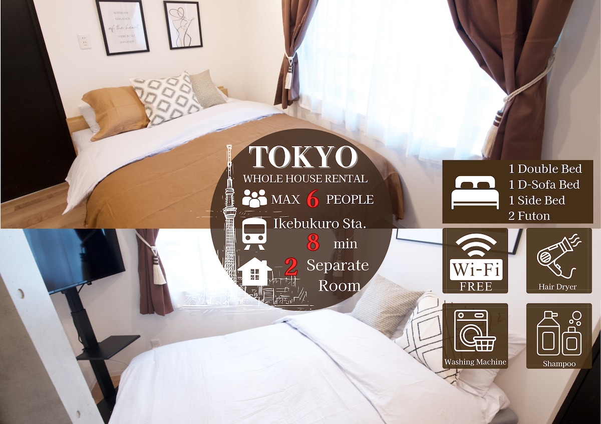 5 min walk from Ikebukuro Sta/2 bedrooms /Max 6