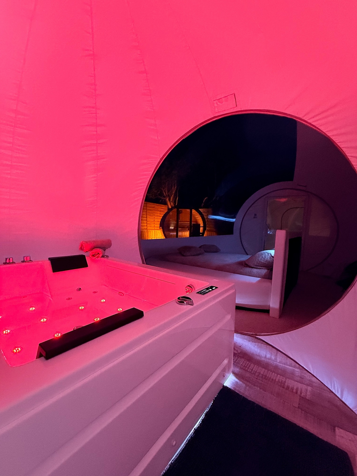 La Bubles47Spa田園詩般的水療泡泡在星空下提供浪漫的度假體驗,配有1.8公尺寬雙人牀,提供極致舒適的住宿體驗。 配備Balneo浴缸,讓您完全放鬆身心,並提供深度放鬆的桶式桑拿房,提供奢華的體驗。 這個泡泡有暖氣和空調,是度過難忘夜晚的完美場所,您可以在那裡欣賞星空