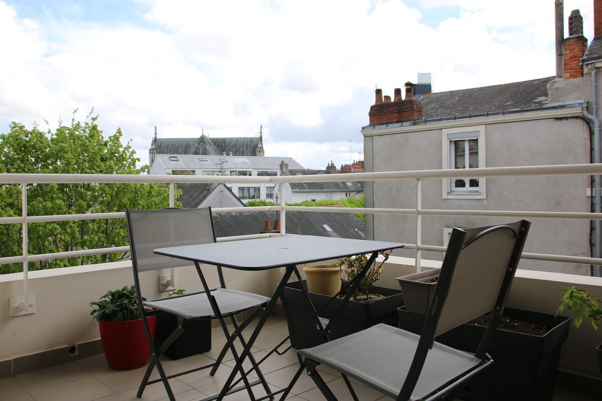 Bienvenue dans notre duplex, situé au cœur du centre-ville de Nantes au rez-de-chaussée d'un bel immeuble ancien en face du lycée Jules Vernes. Dans une rue piétonne, au calme (hormis aux heures d'intercours), à deux pas de la place Aristide Briand, il est un parfait pied à terre pour découvrir la ville. Vous pourrez profiter à proximité d'un large choix de lieux culturels, de boutiques, d'excellents restaurants et de commerces de bouche selon vos envies et votre budget.