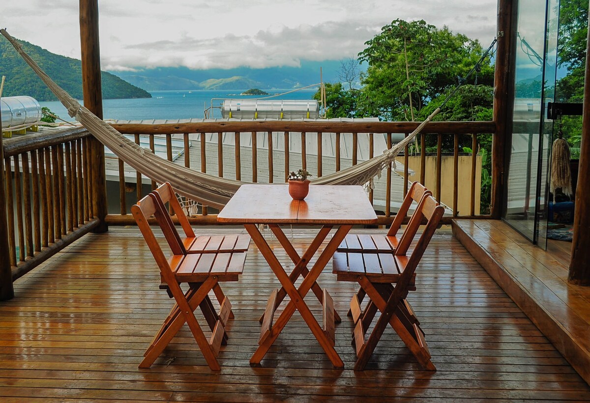 2層度假木屋和俯瞰大海的景點,周圍是大西洋森林。 有兩間臥室、辦公室、可通往涼亭的上層甲板、設備齊全的廚房、配備Netflix的電視房、浴室、設有圍欄的後院、淋浴間、燒烤和帶果樹的花園。 我們在整個房源都有Wi-Fi。 我們距離碼頭僅10分鐘路程,距離Vila do Abraão的商店僅7分鐘路程。 這裡不僅是住宿,還是沉浸在大自然中的體驗: Ł - Ł)