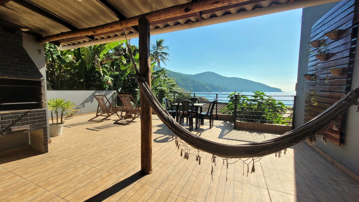 2-storey chalet and a viewpoint overlooking the sea surrounded by the Atlantic Forest. There are 2 bedrooms, office, upper deck with access to the gazebo, equipped kitchen, TV room with Netflix, bathroom, fully fenced backyard, shower, barbecue and garden with fruit trees. We have Wi-Fi throughout the property. We are just 10 minutes from the pier and 7 minutes from the shops of Vila do Abraão. Here it is not just accommodation but an experience of immersion in nature :-)