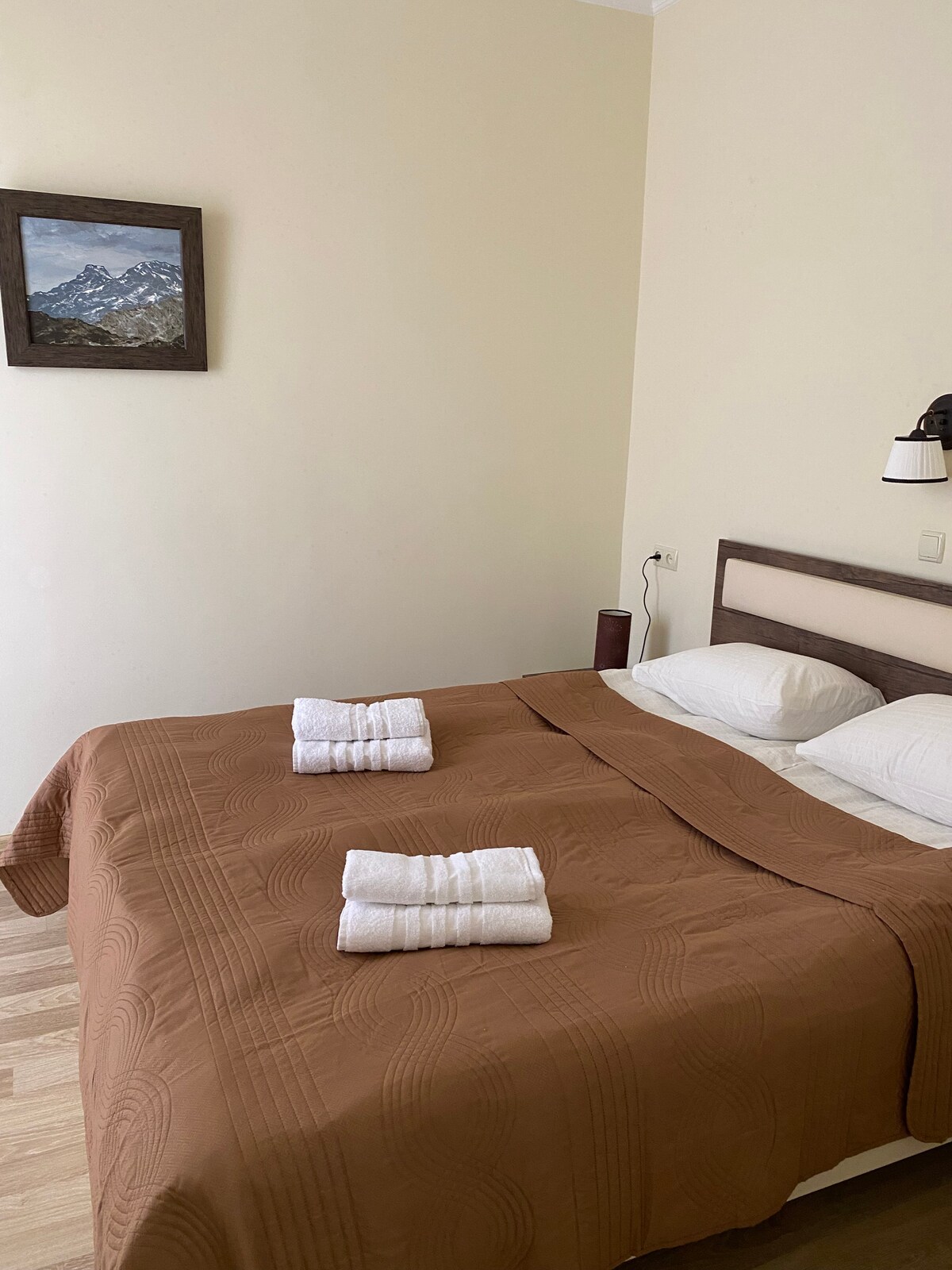 Newly refurbished luxury apartment in heart of Borjomi. Luxury bathroom with Grohe Rainshower. Two bedrooms with two comfortable beds in each bedroom. Fully fitted kitchen with kettle, toaster, hob, fridge, freezer and washing machine. Sitting room with one sofa bed and one folding bed. Beautiful view of mountains. Outside: covered terrace and well maintained gardens. Very close from Museum, supermarkets, train and bus stations and famous Borjomi park.